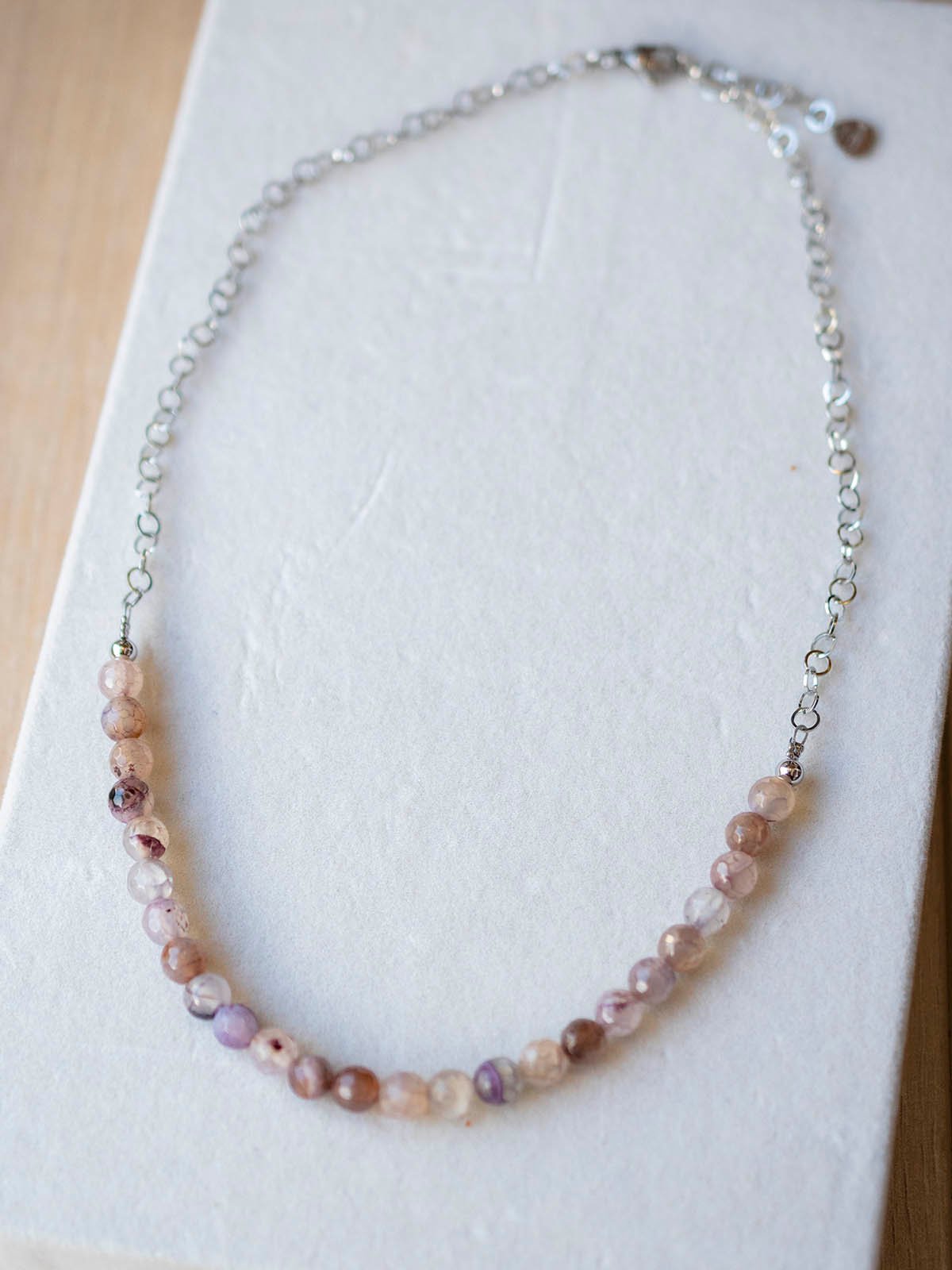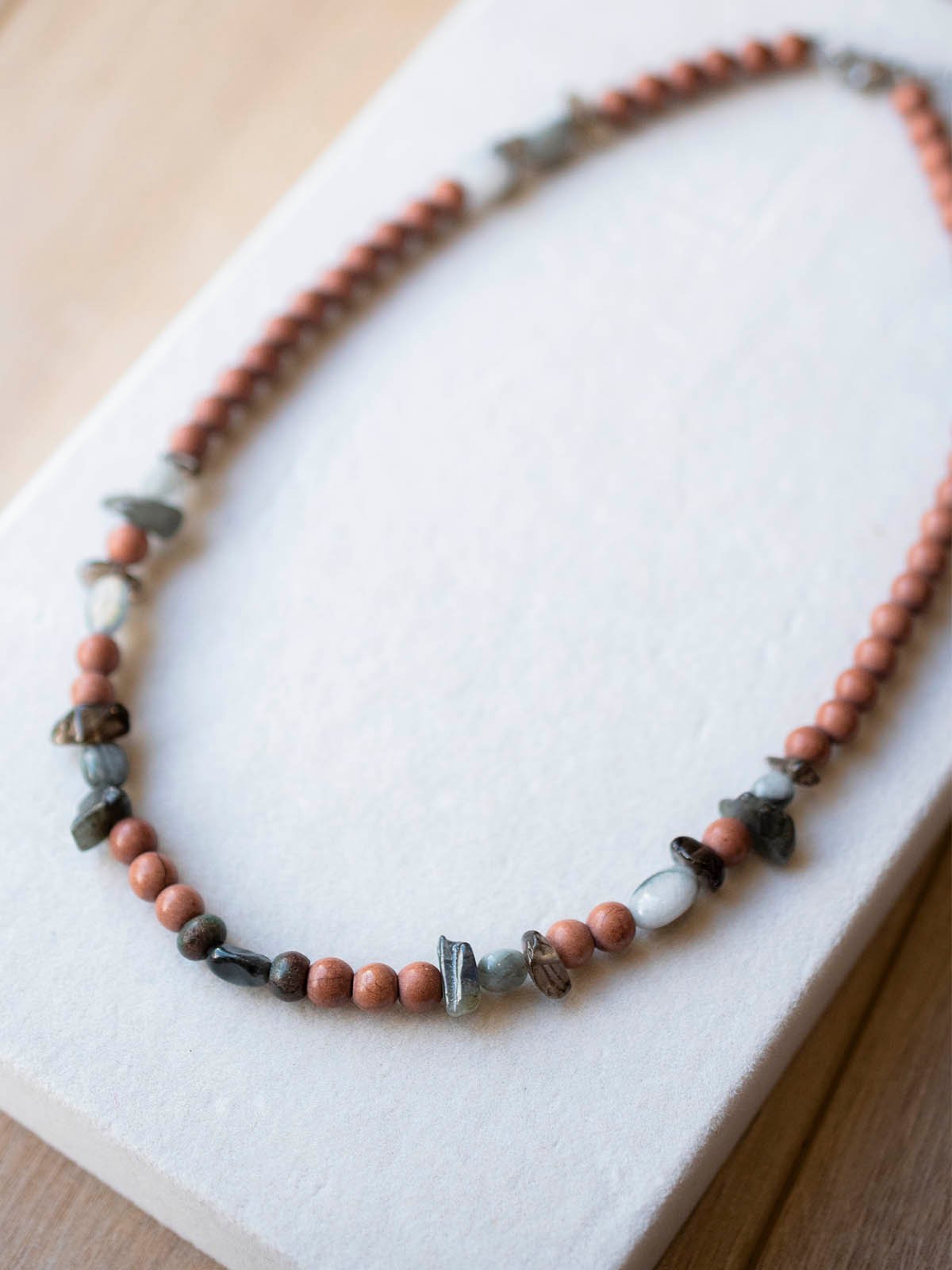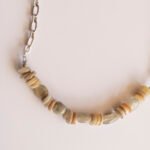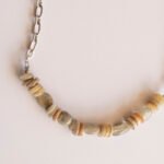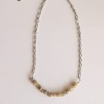 Χειροποίητο κολιέ με ατσάλινη αλυσίδα σε ασημί χρώμα με ημιπολύτιμες πέτρες σε γκρι αποχρώσεις. Το κούμπωμα είναι από ανοξείδωτο ατσάλι που δεν μαυρίζει, ούτε προκαλεί αλλεργίες.