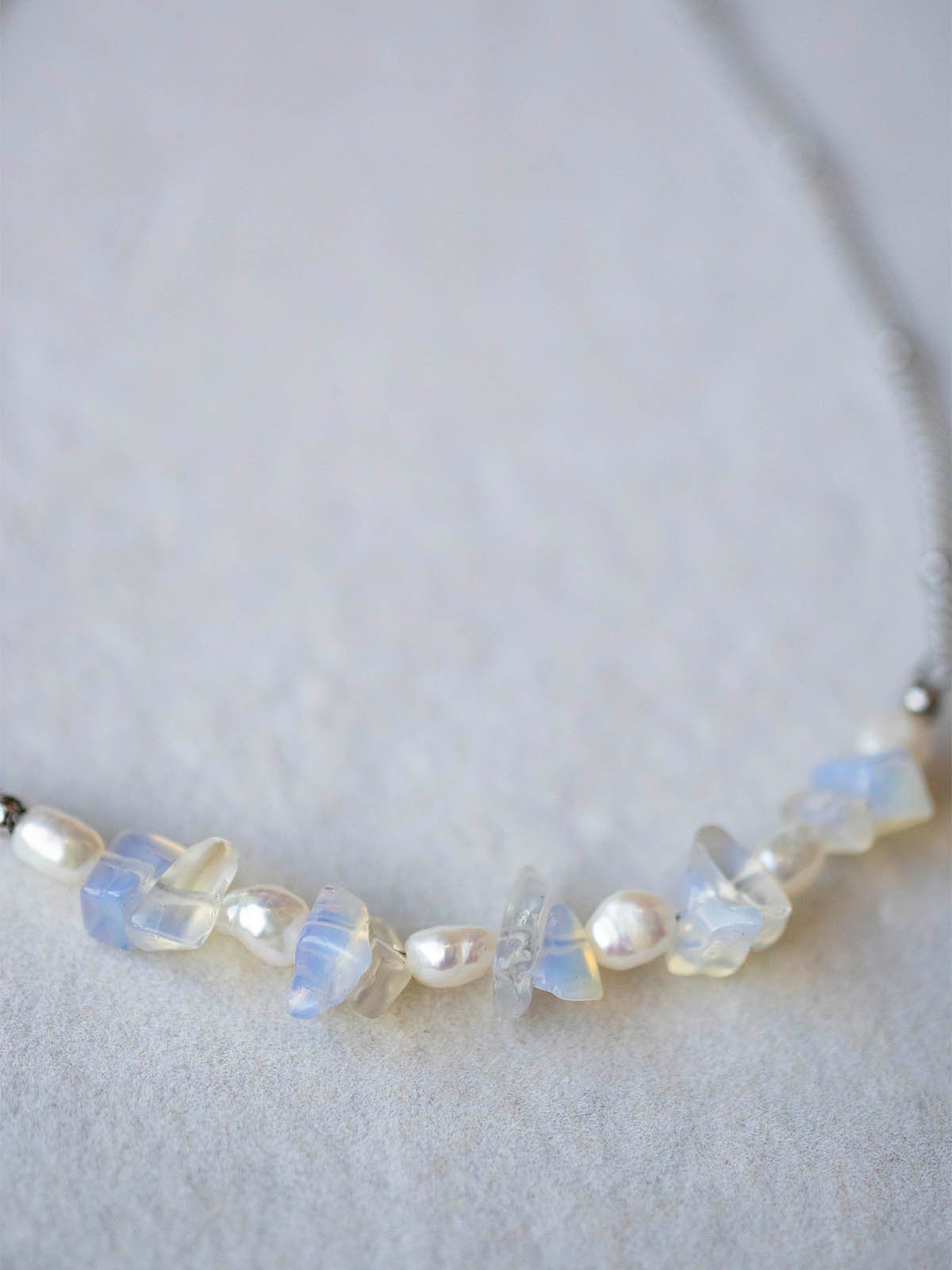 Χειροποίητο κολιέ με ατσάλινη αλυσίδα σε ασημί χρώμα με ημιπολύτιμες πέτρες σε γκρι αποχρώσεις. Το κούμπωμα είναι από ανοξείδωτο ατσάλι που δεν μαυρίζει, ούτε προκαλεί αλλεργίες.