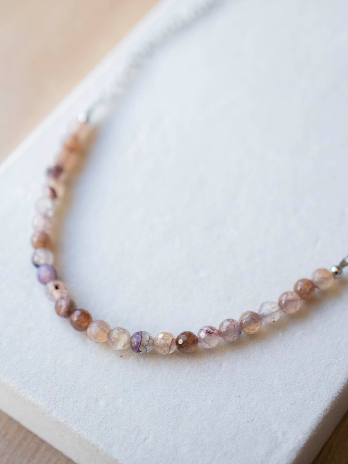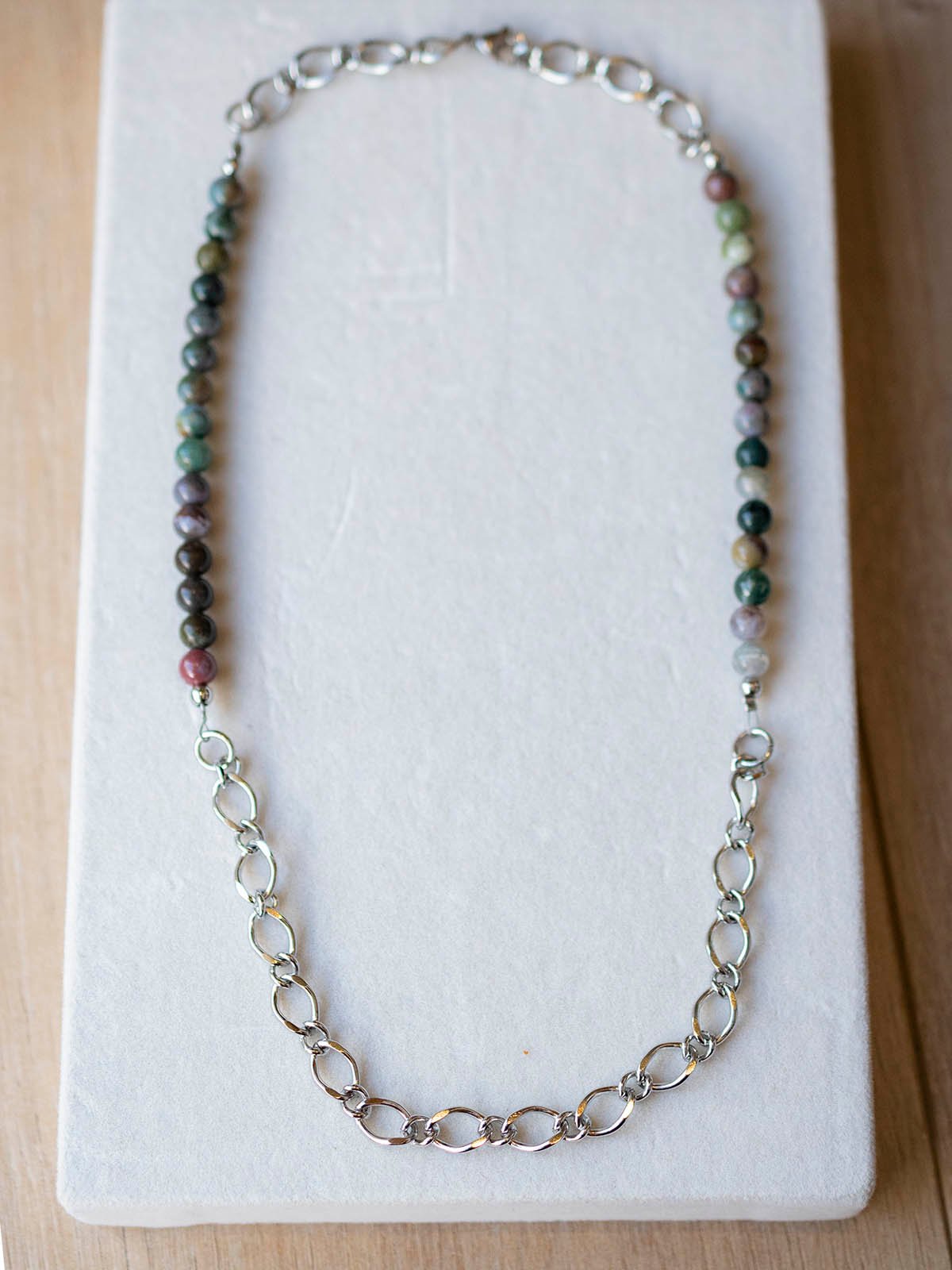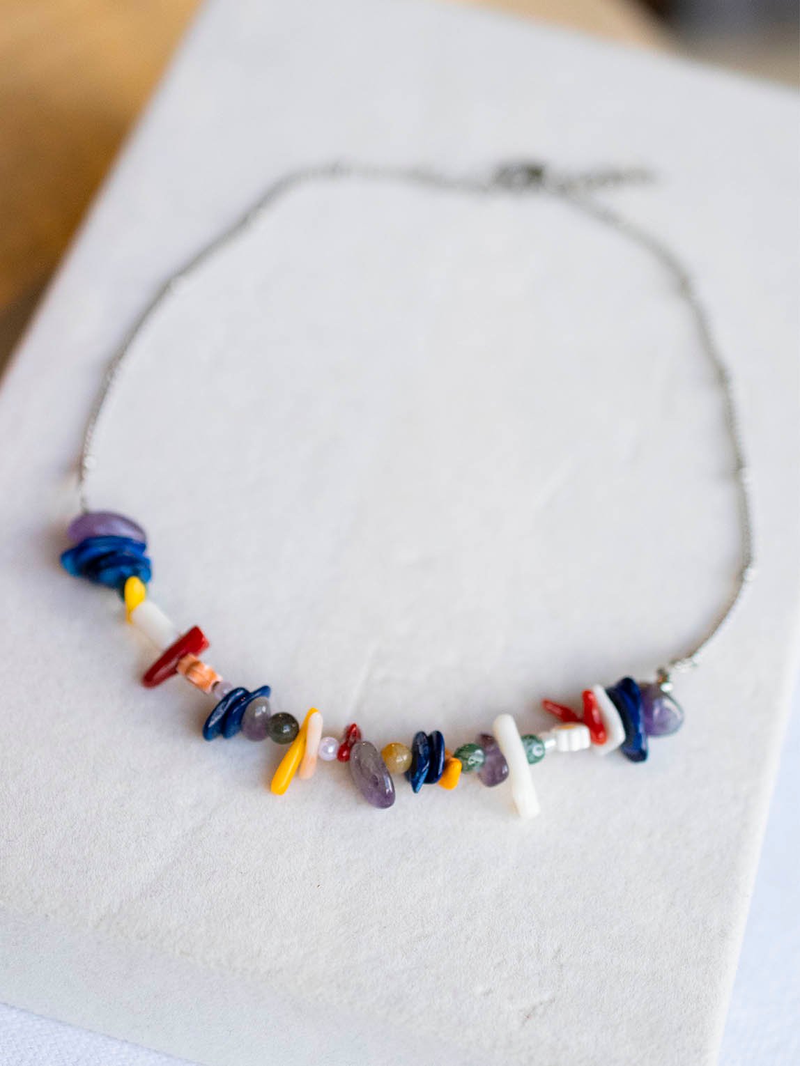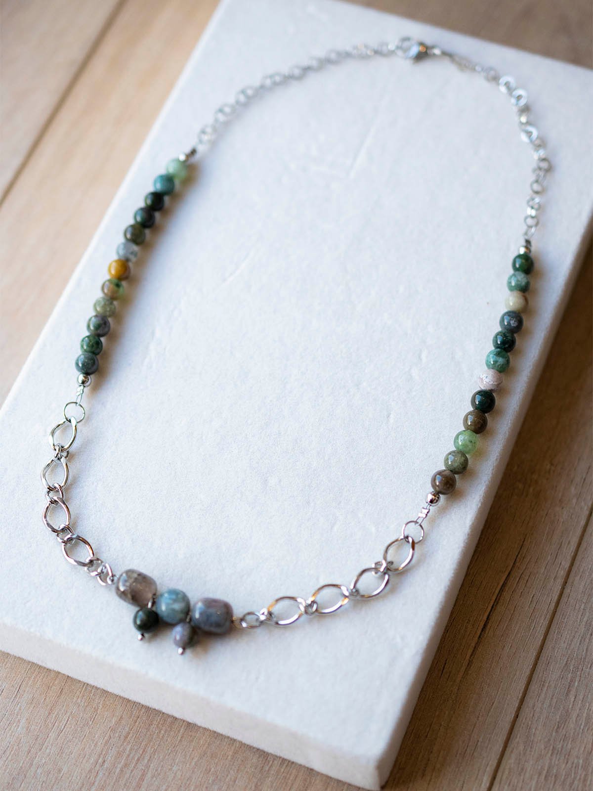 Χειροποίητο κολιέ με ημιπολύτιμες πέτρες και ατσάλινη αλυσίδα σε ασημί χρώμα. Δεν μαυρίζει.