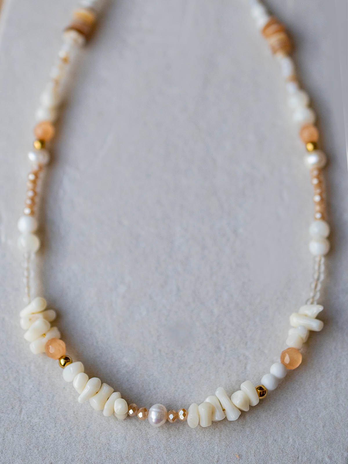 Χειροποίητο κολιέ με ατσάλινη αλυσίδα σε χρυσό χρώμα και λευκές χάντρες φίλντισι. Το κολιέ δεν μαυρίζει, ούτε προκαλεί αλλεργίες.