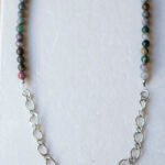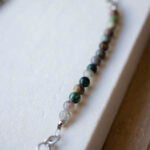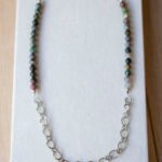 Χειροποίητο μακρύ κολιέ με ημιπολύτιμες πέτρες αχάτη σε γήινες αποχρώσεις πράσινο – καφέ και ατσάλινη αλυσίδα σε ασημί χρώμα. Το κολιέ δεν μαυρίζει ούτε προκαλεί αλλεργίες.