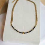 Χειροποίητο κολιέ με μαύρα κρυσταλλάκια και ατσάλινα στοιχεία σε χρυσό χρώμα. Το κολιέ είναι από ανοξείδωτο ατσάλι που δεν μαυρίζει, ούτε προκαλεί αλλεργίες.